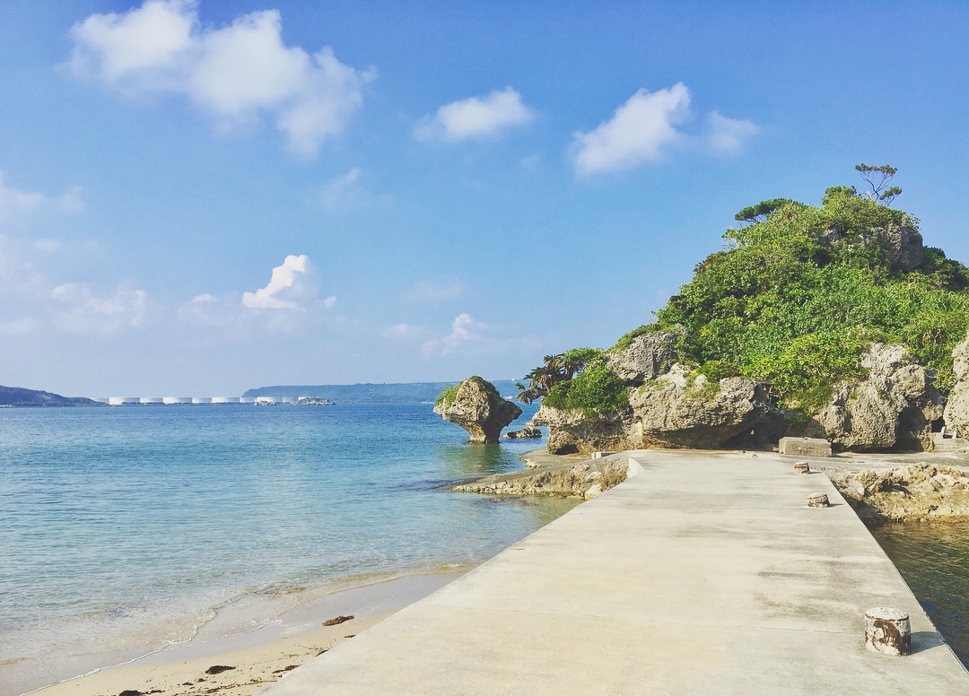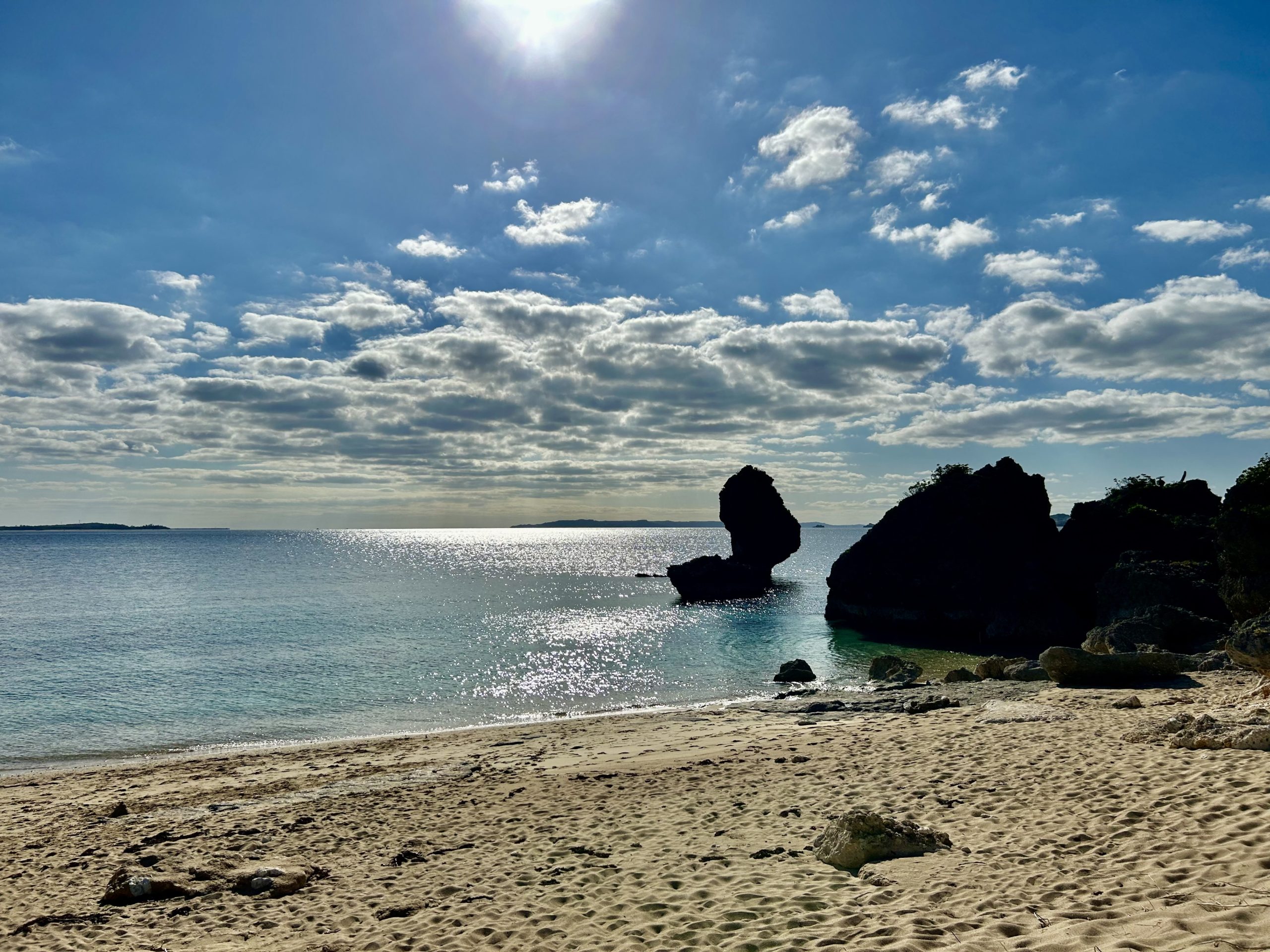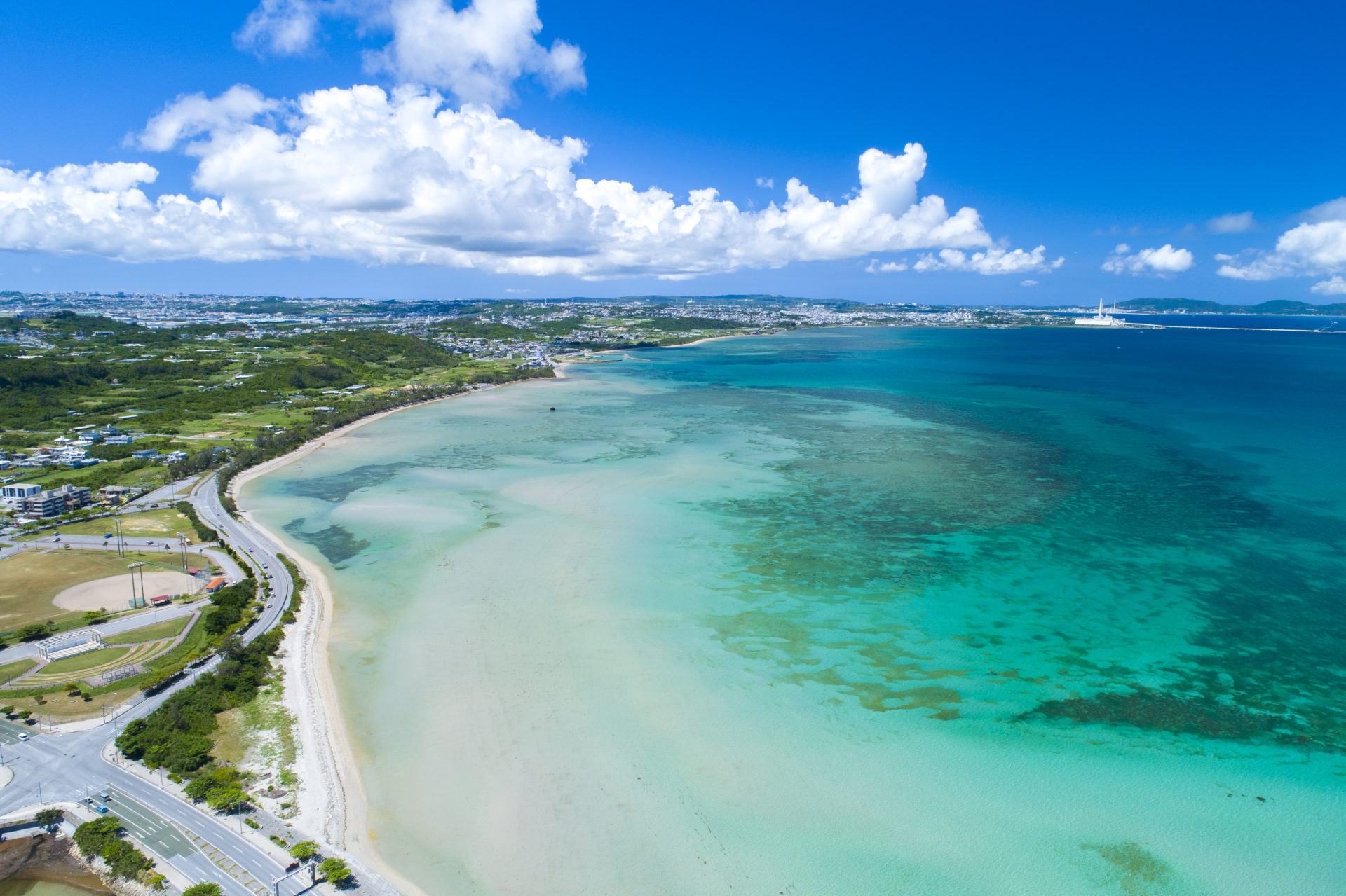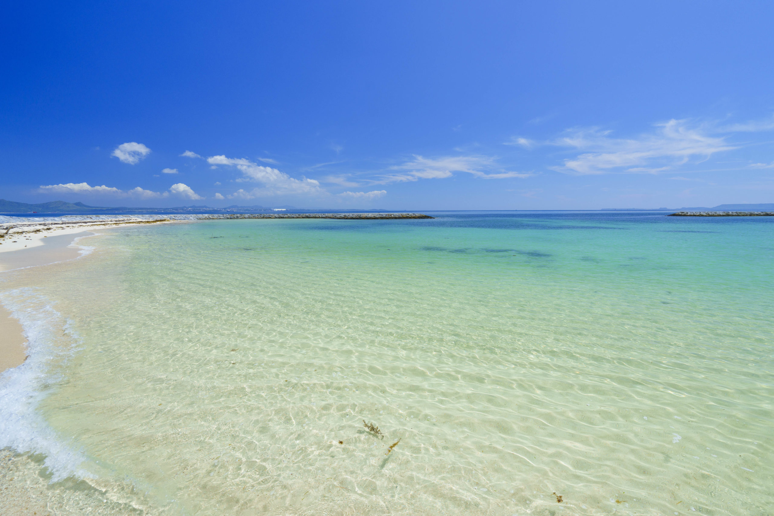 具志川ビーチから東恩納へ続く遠浅の青とゆるい波、