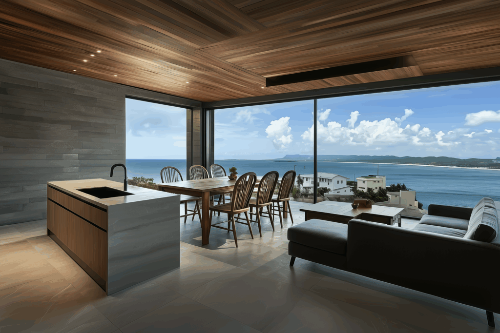 2階リビングの大きな開口が景色を大きく招き入れ、海と空の広がりをそのまま感じる。